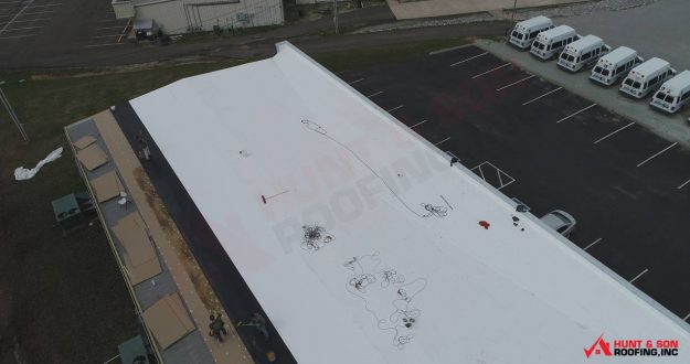 Using the TPO system and state of the art equipment, this single ply system is heat welded by machine for consistency and less human error. The project is over 100K sqft of warehousing that demands dry conditions.